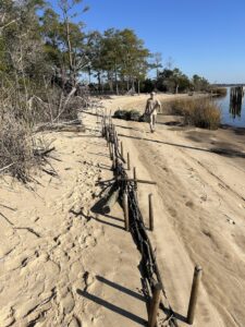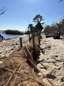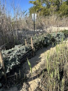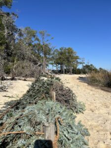 Update: After a year on the beach, the wooden bundles have trapped 1+ feet of sediment behind them. In December of 2025, our team recycled Christmas trees to add more material to help trap even more sediment.